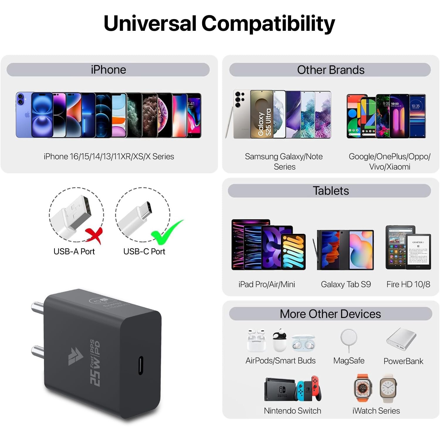 Included Components :Â 1X 25W Adapter & 1X Type C Data Cable.